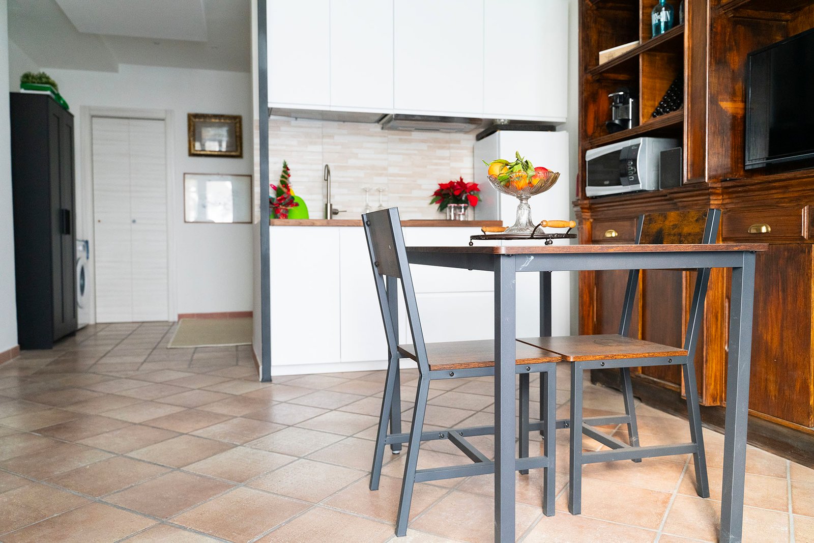 Fridge/freezer, induction hob, microwave oven, basic cooking utensils (pots and pans for induction, oil, salt, pepper, spices), plates and cutlery, kettle, Nespresso coffee machine, wine glasses, dining table, coffee capsules